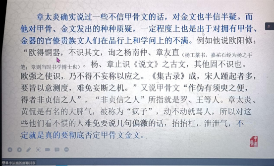 首先,李老师对于国学的概念和章黄对于国学的强调和重视进行了讲解,章黄特别重视“独有”的国学,“尊信国史,保全中国语言文字,此余之志也”。可以说,章黄虽属通学,但其主要学术成就还是在语言文字学。章黄所谓“历史”是广义的,“六经皆史”,诸子亦史。对于经史的理解阐释实际上就是训诂,也属于中国语言文字学。